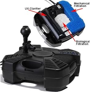 Complete fountain and filtration kit for ponds and water gardens Built-in UV clarifier helps keep pond water clean and clear Easy-to-install pond filter kit sets up right out of the box Pond filter installation has never been easier. The Lifegard Aquatics Complete Pond Filter System takes the guesswork out of complicated pump and filter selection. Compact, submersible pond filtration system provides mechanical and biological filtration plus the built-in 9-watt UV clarifier helps keep pond water crystal clear. Installs right out of the box and includes 4 interchangeable fountainheads to create a beautiful and soothing water feature. 25 ft power cord. Measures 14" x 14" x 20" high (with fountain head). For ponds and water gardens between 300 and 1,500 gallons. Includes: 9 watt UV lamp, mechanical filter sponge, biological filter media, Fountain Kit with diverter valve, Fountain head (4 different patterns), and 679 gph pump. Please click on "More Information" for installation instructions.