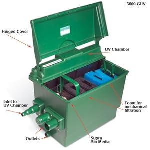 Gravity Models require installation at or above desired outlet level, i.e. at the top of a waterfall. Fish Mate gravity filters are economically priced and feature UV tubes positioned over the water, thus eliminating issues of scaling, quartz tube replacement and frost damage associated with conventional UV clarifiers