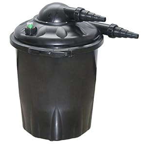 Unique external pressure indicator shows green when filter is performing properly and shows red when filter cleaning is necessary. Meant to be partially buried. Approximate dimensions: 15in x 11in x 11in Built in 9 watt UV light to eliminate green water